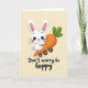 Este cartão mostra um fundo amarelo pálido com um coelho branco estilizado centrado na cena, seu rosto redondo voltado para frente com grandes olhos pretos, um nariz vermelho minúsculo e orelhas com forro rosa. O coelho abraça uma cenoura laranja superdimensionada como se fosse um amigo próximo, seus braços envoltos em um abraço apertado que é lido como afetuoso e um pouco sedutor 🐰. A cenoura é desenhada como um passeiozinho estranho com quatro rodas circulares escuras, dando à cena um sentido suave de movimento. Sombreamento suave e gradientes suaves adicionam profundidade ao redor das bochechas do coelho, das curvas da cenoura e das rodas, mantendo a aparência suave e aconchegante. Uma curta frase no estilo de trocadilho está abaixo da ilustração em letras escuras, colocada baixa e centralizada para que a imagem continue sendo o foco principal. Tons quentes de creme se misturam com laranja brilhante e um toque de verde no topo da cenoura, com pequenas