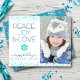 "Paz, alegria e amor." Uma ilustração divertida, divertida, azul turquesa com falso filme em folha de neve, pontos confetti, e tipografia moderna azul-turquesa e marinho sobre um fundo branco e limpo, juntamente com a foto personalizada de sua escolha, o ajudem a insistir na temporada de festas. Um padrão aleatório de floco de neve branco sobrepõe azul de turquesa no verso. Sinta o calor e a alegria dos feriados sempre que você envia este cartão de cartões de natal personalizado, gráfico, impressionante. Estão também disponíveis envelopes, adesivos, sacos de tote, papel de embrulho, tabuleiros de serviço, decoração doméstica e muito mais. Mande isso para alguém especial! Basta substituir a foto de exemplo por uma de suas, digitar os nomes de sua escolha e personalizar facilmente este cartão de cartões de natal de fotos orçamentárias. Por favor, me mande mensagens com quaisquer perguntas ou solicitações.