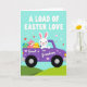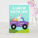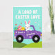 Concebido com uma cena primaveril doce, este cartão apresenta um personagem de coelho branco dirigindo uma camionete roxa estilizada por colinas verdes onduladas sob um céu aqua pálido 🐰. Pequenas formas de coração pairam ao redor da cena, adicionando um clima suave e afetuoso, como se o motorista estivesse entregando uma surpresa carinhosa para alguém especial. No topo, a frase “UMA CARGA DE AMOR DE PÁSCOA” aparece em letras maiúsculas grandes, definida em uma cor de tom claro que se destaca claramente contra o céu. Na lateral da camionete, as palavras “Bisneto” estão impressas em uma cor clara contrastante, colocadas como um rótulo no painel da porta. Na carroceria da camionete, um coelho rosa menor relaxa entre ovos decorados, com padrões como listras e pontos em azuis, amarelos e vermelhos 🐇. Alguns corações minúsculos também decoram a carroceria da camionete, ligando a mensagem à imagem sem lotar o layout.