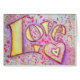 Cores d'água pintando a palavra amarela ouro "Amor" com um duplo coração. Rosa e roxo destaca as letras e o coração. Uma luz de brilho no topo dá à pintura um brilho brilhante.