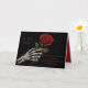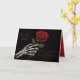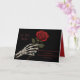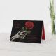 Um cartão de saudação sombrio e romântico com uma mão de esqueleto segurando uma única rosa vermelha, com a frase "Amor que Assombra" em uma fonte assustadora e uma mensagem poética abaixo.