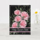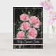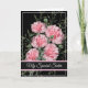 O cartão de aniversário é mostrado com fundo preto e cravos cor-de-rosa bonito. A placa tamanho 5" x 7" tem um dentro de mensagem especial. Personalize este cartão ou comprar como está. Imagem do stock