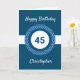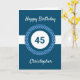 Um cartão de aniversário de 45 anos azul personalizado, que você pode facilmente personalizar com seu nome na frente do cartão. Você também pode personalizar a mensagem do dentro, se quiser. Este cartão de aniversário azul personalizado de 45 anos para ele faria uma manutenção de excelente.
