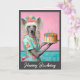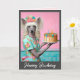 Dama de Cachorro Chinesa segurando um bolo de aniversário com três velas. Cartão de saudação personalizável com a opção de alterar texto e imagens clicando em Personalizar este modelo.