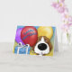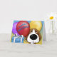 Adorável Big Nose Beagle com um presente de aniversário e segurando balões em sua boca. Balão lê Rappy Rirthday!