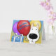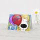 Adorável Grande Touro Nose Terrier com um presente de aniversário e segurando balões em sua boca. Balão lê Rappy Rirthday!