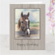Este cartão de boas-vindas de aniversário mostra que a imagem de um cavalo marrom que se encontra no paddock tem uma qualidade macia e sonhadora.