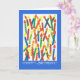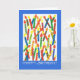 Um cartão de aniversário atraente, com velas brilhantemente coloridas sobre fundo branco com uma borda azul brilhante, de uma colagem de papel pintada à mão por Judy Adamson. Sinta-se à vontade para personalizar a mensagem dentro.