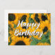 Nada é mais alegre e ensolarado do que este lindo cartão de aniversário de girassol. A bela fonte cursiva lê Feliz Aniversário sobre um campo de lindos girassóis.
