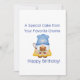 Cartão com seu Gnome Favorito segurando um bolo especial com uma saudação de Feliz Aniversário.