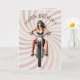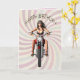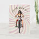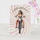 Uma garota andando de moto com o vento soprando o cabelo. Um cartão de excelente para o homem que ama suas bicicletas!