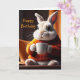 Este cartão de aniversário bonito apresenta um coelho confortável tomando café matinal.