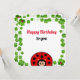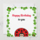Cartão de aniversário com uma joaninha feliz cercada por trevos de quatro folhas da sorte. Ideal para todos. A joaninha é um símbolo universal de boa sorte! Ótimo para crianças e adultos!