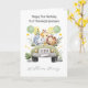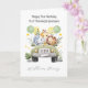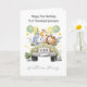 Este cartão de 1º aniversário em aquarela é adequado para um menino ou menina. O design inclui estrelas de aniversário, balões de aniversário verdes e amarelos, e um carro safari com um elefante, girafa e leão dentro. Todo o texto é totalmente personalizável.