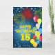Explodir fogos de artifício acende o céu neste espetacular cartão de aniversário de 15. Muitos balões de celebração contribuem para o sentimento do partido. Um cartão de aniversário adequado para todos. Norma Cornes.