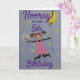 Um delicioso cartão de aniversário de 5 anos para uma menina, pulando de alegria, vestida de rosa e segurando flores e um balão nas mãos.
