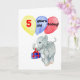 Um cartão de aniversário para uma criança de 5 anos com um carregando de elefante para bebês pintado à mão, um presente e balões. dentro de "Parabéns".