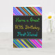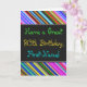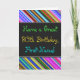 Este design de cartão de saudação divertido, colorido e caprichoso, com tema de aniversário, apresenta um desejo de aniversário caloroso como "Tenha um 80 de aniversário, Primeiro Nome!" na frente. O nome na frente pode ser personalizado. Há também listras multicoloridas na parte superior e inferior da frente. O dentro apresenta uma mensagem de aniversário que pode ser personalizada. Um cartão de boas-vindas como este pode ser uma maneira divertida de fazer votos de aniversário a alguém que comemora o seu oitavo aniversário. [~Z0000269]