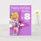 Crianças bonitas, moça personalizada gráfica moderna com cartão de aniversário de cabelos loiros em tons roxos. Personalize com sua própria escolha de nome e idade, atualmente lê Happy Birthday Ashley 8 hoje. Desenvolvido e ilustrado exclusivamente por Sarah Trett.