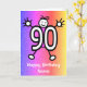 Lindo desenho de um número 90 com rosto sorridente, mãos e pés. O cartão tem um fundo com efeito de brilho colorido. Envie este cartão para desejar um feliz aniversário de 90 anos! Personalize facilmente este cartão editando o texto do modelo na frente e no interior. Obrigado por visualizar meus designs!