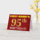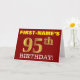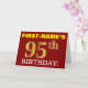 Este design de cartão de saudação de aniversário apresenta uma mensagem como "FIRST-NAME'S 95th BIRTHDAY!", com o "95º" a ter uma aparência falsa/imitada de cor dourada. O nome do destinatário na frente pode ser personalizado e o fundo frontal é vermelho colorido. Também apresenta uma mensagem de saudação de aniversário personalizada no dentro. Um cartão de cumprimentos de aniversário como este talvez pudesse ser dado a alguém em comemoração do seu 90º aniversário. [~Z0000184]