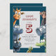 Entra numa fantástica celebração de 5 com este convite engraçado para animais safari! Esta design de revelação apresenta uma coleção de criaturas hilárias e amigáveis de safari, incluindo um macaco-prego, uma girafa-pateta, e um crocodilo-resmungão, pronto para festa. As trabalho de arte vivas e as cores ousadas certamente capturam a atenção de todos os seus convidados e definem um humor lúdico para o evento. É a maneira perfeita de convidar amigos e família para celebrar o quinto aniversário do seu filho em estilo e diversão.