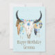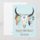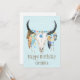Ilustração de cor aquosa moderna e ligeiramente esmerilada das penas de Boho e do crânio decorado de miçanga/vaca com texto personalizável de "Feliz Aniversário" sobre um fundo texturizado de cor azul clara.
