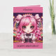 Cartão de aniversário editável com uma garota chibi fofa e cabelo cor-de-rosa e um fundo de feira. Cartão divertido para qualquer ocasião, basta mudar o texto ou deixar o vazio se preferir escrever a sua própria mensagem.