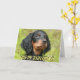 Cartão de saudação de fotos de filhotes Gordon Setter. O texto na frente diz "Parabéns!", e o texto dentro diz "Espero que você tenha um dia excelente!" Todo o texto pode ser personalizado para sua própria mensagem pessoal exclusiva.