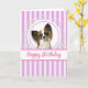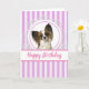 Adicione a sua saudação a este cartão de cão fofo. Este cartão de aniversário foi criado de uma fotografia de um Papillon. Um design com cadáveres com cadáveres falsos, listras e saudações de aniversário.