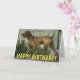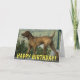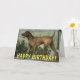 Vizsla cão a arranjar o cartão de boas-vindas. Texto na frente diz "Feliz aniversário!" e dentro de texto lê "Espero que você tenha um dia de excelente!"