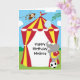 Um adorável design de aniversário com uma tenda de circo com um elefante segurando um balão na frente da tenda e um macaco balançando de uma videira. Perfeito por celebrar o aniversário de uma criança para o amante do circo.