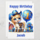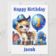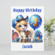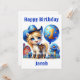 Um adorável pônei cowboy está celebrando seu primeiro aniversário com um balão azul com o número 1 e um chapéu azul de cowboy em uma fazenda. Personalize o cartão com o nome do seu filho.