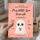 Cartão de aniversário adorável com tema de Halloween apresentando um fantasma kawaii segurando um coração vermelho, cercado por morcegos voando e detalhes assustadores pastel. Perfeito para festas de outubro para crianças, aniversários de outono e celebrações de Halloween sem ser assustadoras. Este design de fantasma pastel fofo é doce, festivo e ideal para adicionar um toque de diversão a qualquer reunião da temporada assustadora.