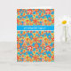 Um cartão de aniversário bonito com o cumprimento em Galês e all over em um teste padrão de flores vermelhas, alaranjadas, amarelas em um fundo brilhante dos azul-céu, de uma colagem de papel pintado à mão por Judy Adamson.