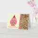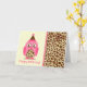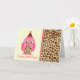 Um cartão de aniversário que ilustra um impressão de girafa e uma coruja rosa. "Feliz Aniversário" debaixo da coruja. Girafa impressão à direita. dentro vazio.
