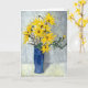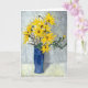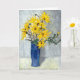 Um cartão de aniversário com uma pintura original de óleo pastel de girassóis em um vaso azul alto.