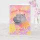 Compartilhe este adorável e fofo cartão de aniversário do hipopótamo com amigos e familiares! Design de placa apresenta um hipopótamo de desenho animado com fundo colorido de flores laranja, rosa e roxa.