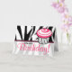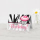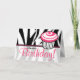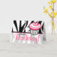 Um cartão de aniversário com um fundo de impressão em zebra preto e branco. A metade inferior apresenta um caimento rosa. O texto preto e rosa diz "Parabéns!" Ilustração de cupcake rosa à direita. Dentro apresenta fundo de impressão em zebra puro. Procure itens correspondentes na categoria "Compro de Aniversário" da loja de Escolas Rosa.