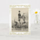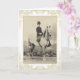Uma reprodução de um antigo cartão postal fotográfico de uma senhora elegante com um longo hábito de equitação negra e um chapéu de cima sentado ao lado de um cavalo de cinza bonito. A fotografia foi tirada por um estúdio francês no final dos anos 1800.