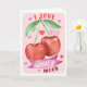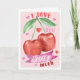 Um cartão de dia dos namorados em aquarela doce e divertido, apresentando duas cerejas sorridentes adoráveis com corações rosa suave e o trocadilho “Eu te amo muito, Cereja.”
