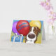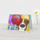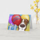 Adorável Pastor Australiano Big Nose com um presente de aniversário e segurando balões em sua boca. Balão lê Rappy Rirthday!