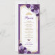 Estes bonitos cartões de menu irão adicionar um toque perfeito à sua ocasião especial. O elegante design apresenta rosas lilás violetas, complementadas por sotaques geométricos dourados e tipografia moderna.