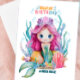 Celebre um aniversário mágico com este maravilhoso cartão de aniversário de sereia personalizado, projetado especialmente para meninas que adoram aventuras no oceano e diversão submarina! Apresentando uma bela ilustração da sereia, elementos do mar brancos e uma doce mensagem de aniversário rimante, esta carta é a perfeita manutenção. Personalize facilmente o nome e a idade da criança para o tornar verdadeiramente especial. Ideal para festas de aniversário com tema de sereia, esta carta é uma escolha maravilhosa para filhas, sobrinhas, netas, ou qualquer fã de sereia. Perfeito para crianças, crianças e adolescentes — este cartão de aniversário de sereia encantador traz brilho e alegria ao seu dia especial!