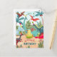Um cartão de aniversário de dinossauro pintado à mão com dinossauros em uma selva pré-histórica. Arte original de Caroline Bonne Müller.