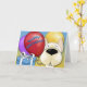 Adorável Bulldog Francês Grande Nariz com um presente de aniversário e segurando balões em sua boca. Balão lê Rappy Rirthday!