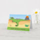 Um cartão de aniversário com um tema de dinossauro. O design apresenta um feroz T-Rex em uma paisagem árida com um vulcão distante em erupção. O Tyrannosaurus é verde com marcações roxas. A frente do cartão é personalizada com o nome do destinatário. O tema é unido com um padrão de pegadas de dinossauro no interior do cartão. Há também um espaço em branco para a sua própria mensagem.