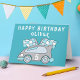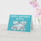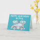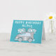 Cartão de Aniversário do Menino com Bandeira de Corrida de Carro Azul. Este cartão tem um carro de corrida azul com uma idade e bandeiras de corrida azuis e brancas. Adicione seu nome e a idade no carro de corrida. Adicione sua mensagem dentro ou apague-a.