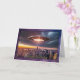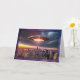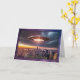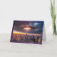 A frente deste cartão de aniversário apresenta uma dramática cena de ficção científica de um grande OVNI pairando sobre a linha do Nova Iorque ao anoitecer. O céu é uma mistura de profundos purgos e laranjas, sugerindo uma invasão por alienígena ou um visitante interestelar no pôr do sol. O Empire State Building é posicionado no centro, diretamente sob o brilho, sob a barriga circular da espaçonave, que emite uma luz radiante. O horizonte icônico da cidade é banhado na última luz do sol, acrescentando uma sensação de grandeza e mistério. Uma borda negra decorativa enquadra a imagem contra um fundo roxo estrelado, melhorando o tema cósmico. As palavras "Feliz Aniversário" são exibidas corajosamente no fundo em elegantes letras douradas, acrescentando um toque festivo a esta cena de outro mundo. Este cartão é ideal para um jovem que é fascinado pelo espaço, OVNIs e aventura. É projetado para cativar a imaginação e oferecer uma emocionante saudação de aniversário que está fora deste mundo.