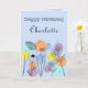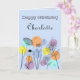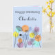 Cartão de aniversário retrô estilo, desenho de linhas de flores em fundo pastel com círculos em cores retrorreflectoras.